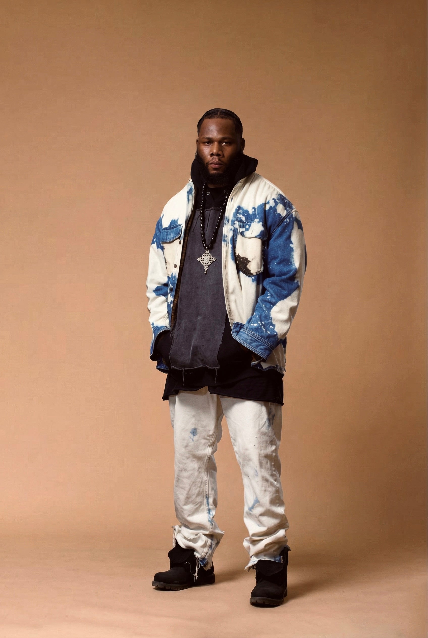 Light Straight-leg baggy denim in soft ecru, washed in sky blue bursts