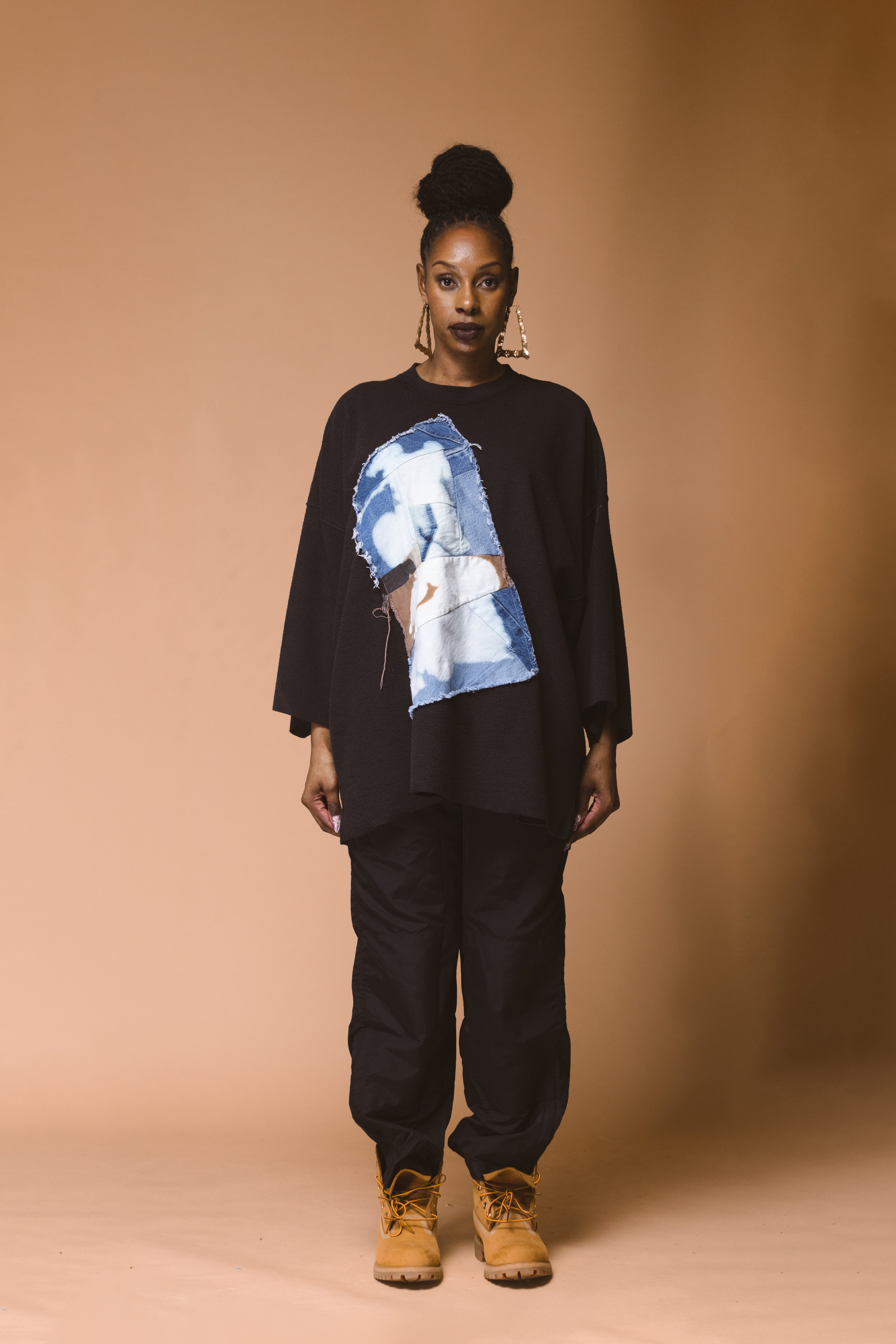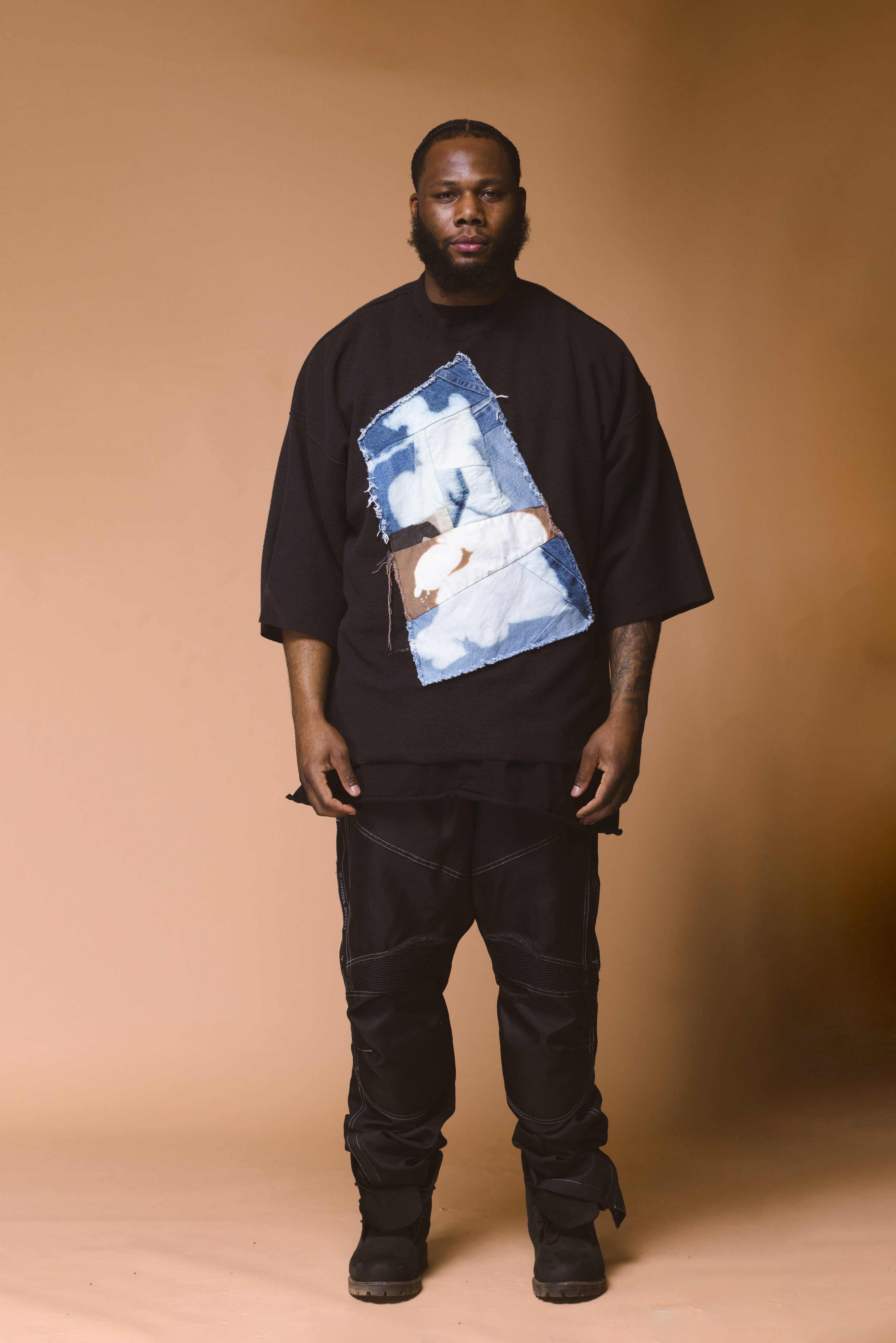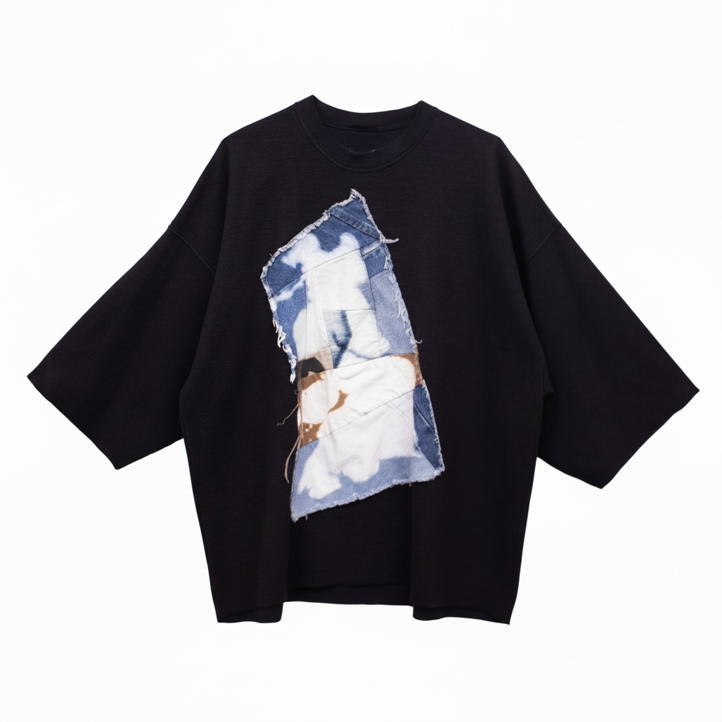 Featuring a raw-edged vertical denim appliqué panel
