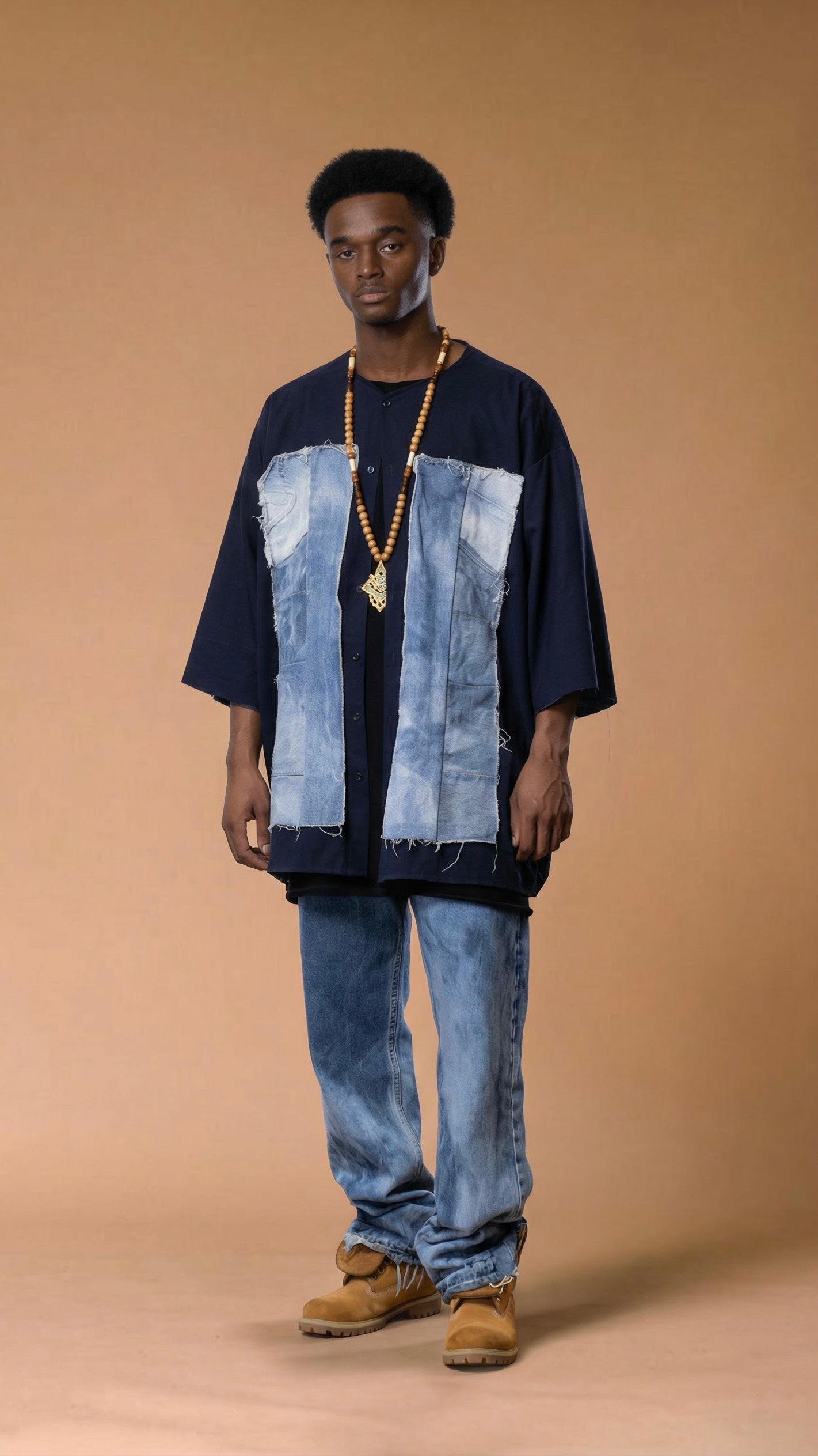 Twin raw-edge denim columns on the front