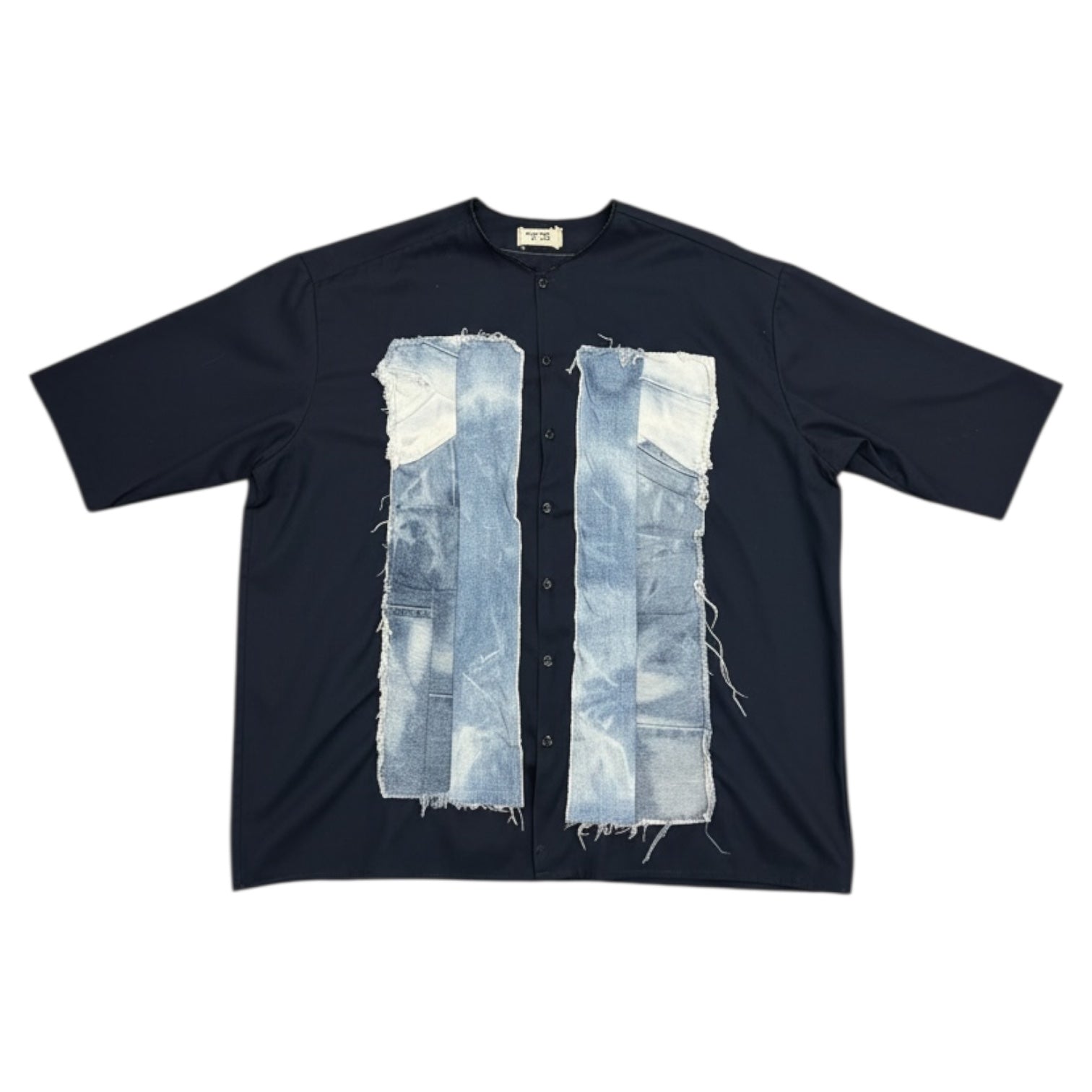 Navy blue boxy short-sleeve shirt with a clean band collar and button up