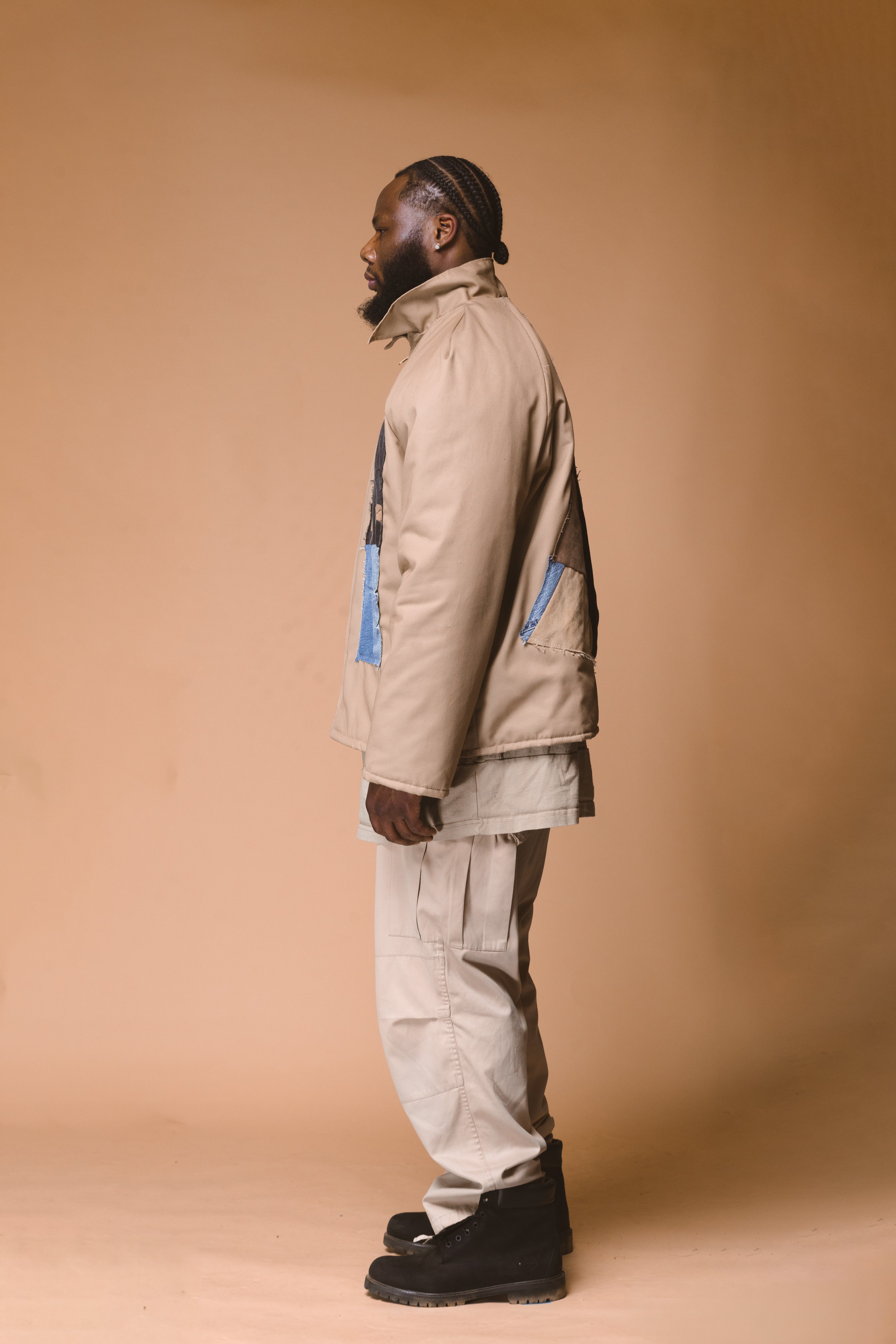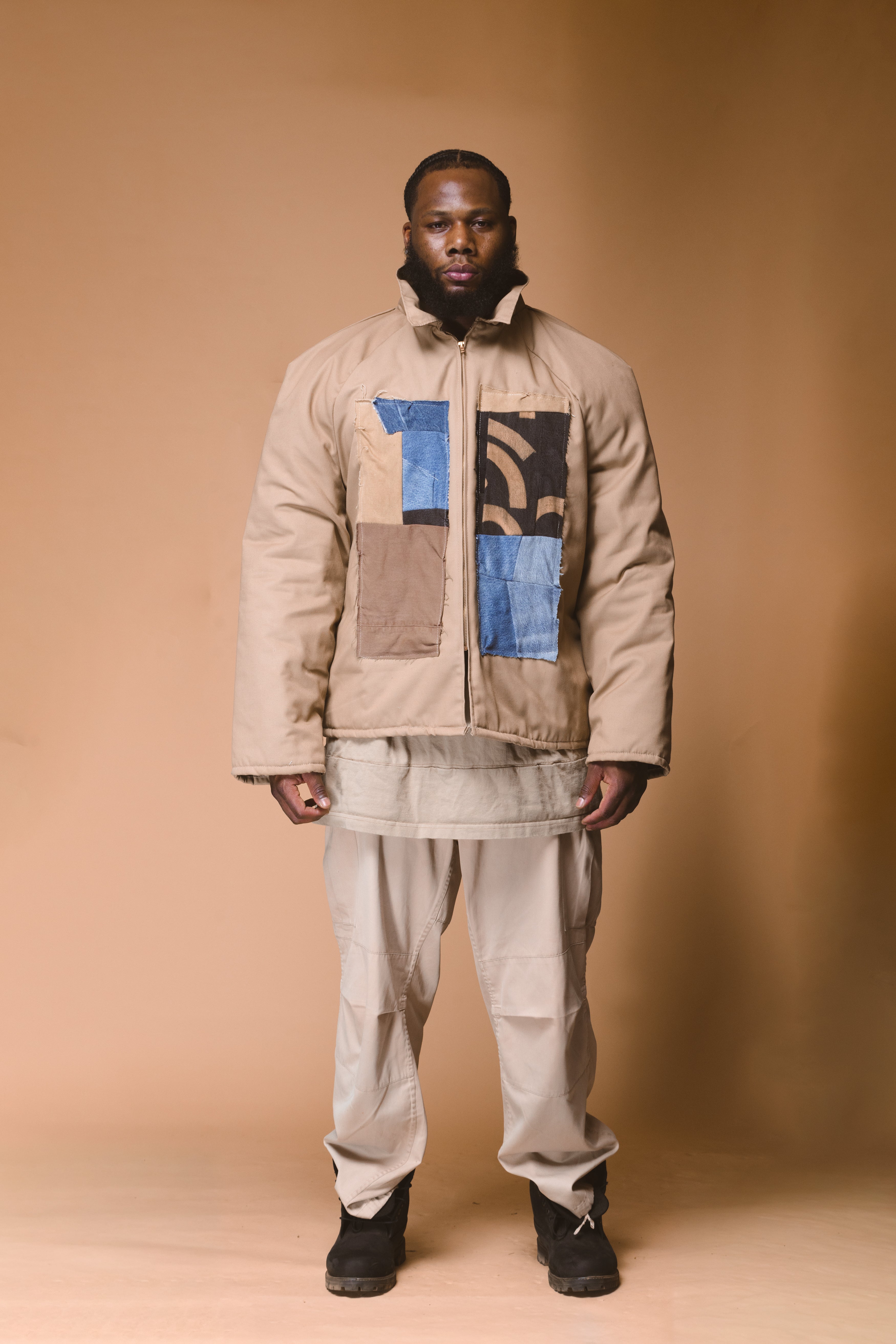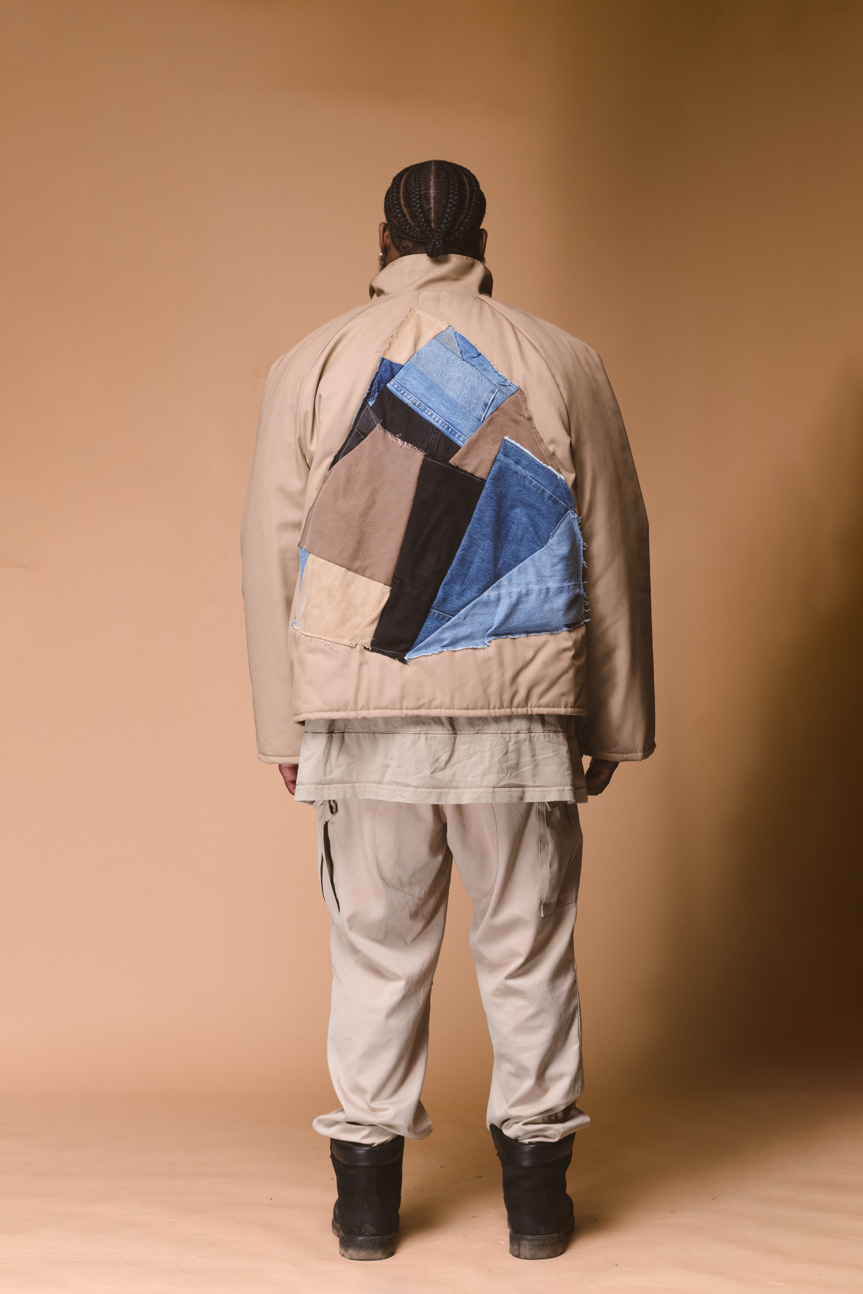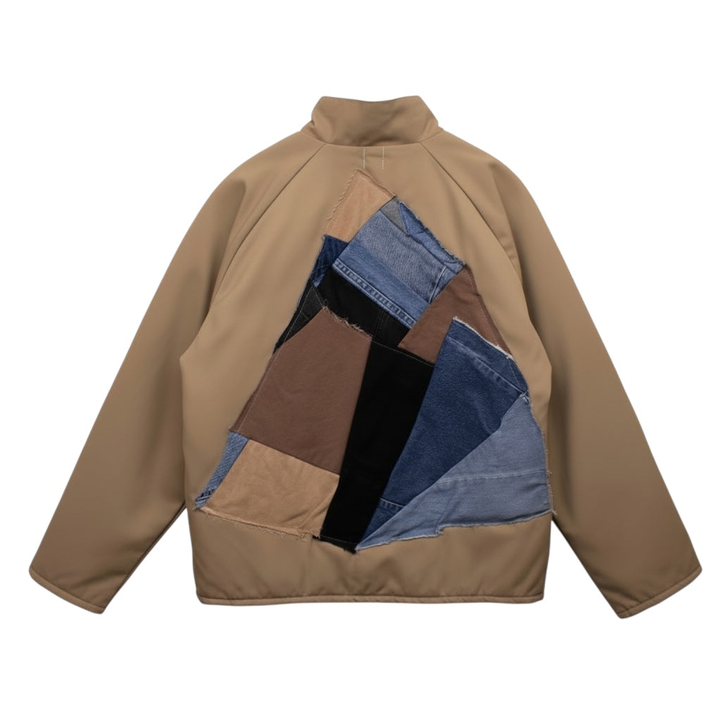 Mid weight zip-front Nylon jacket uses a clean tan shell as the canvas for bold rectangular patchwork in reclaimed denim and dead stock cottons on the front and an oversized geometric collage across the back.
