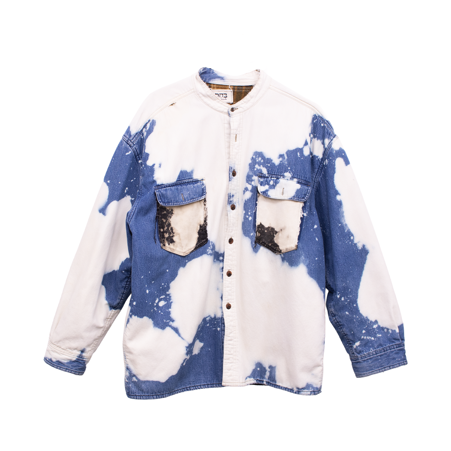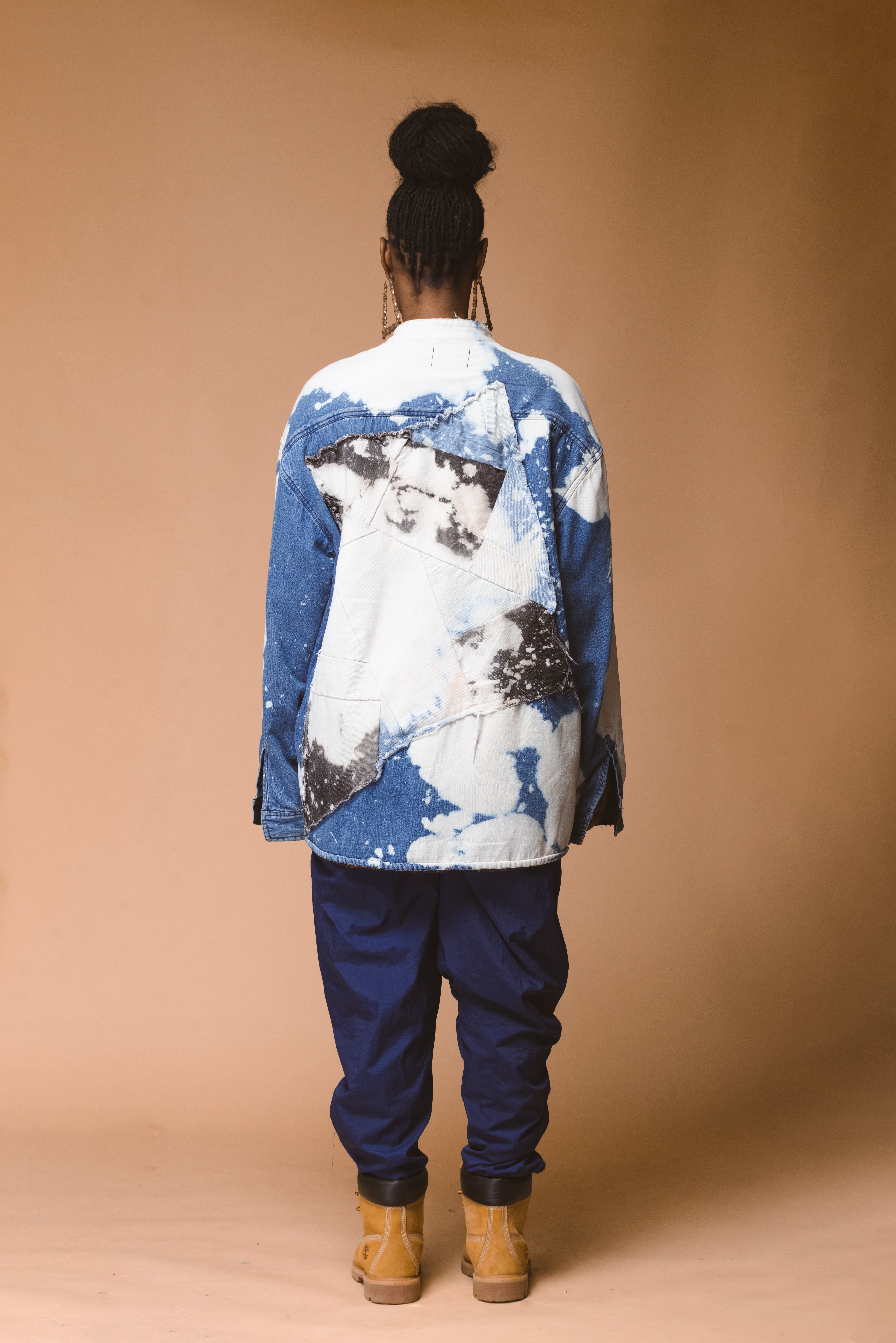 Rinsed washed denim shirt jacket with a mandarin collar.