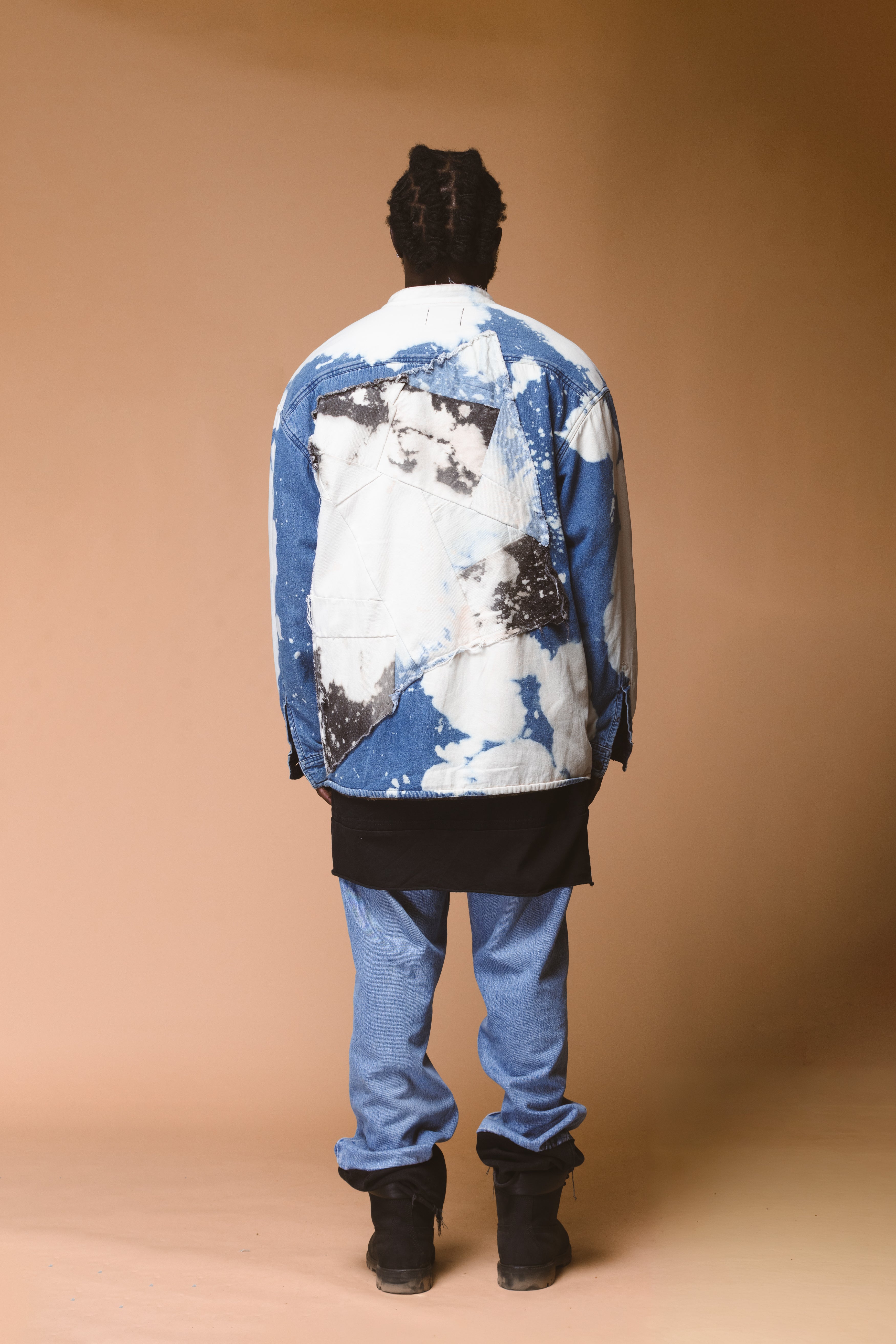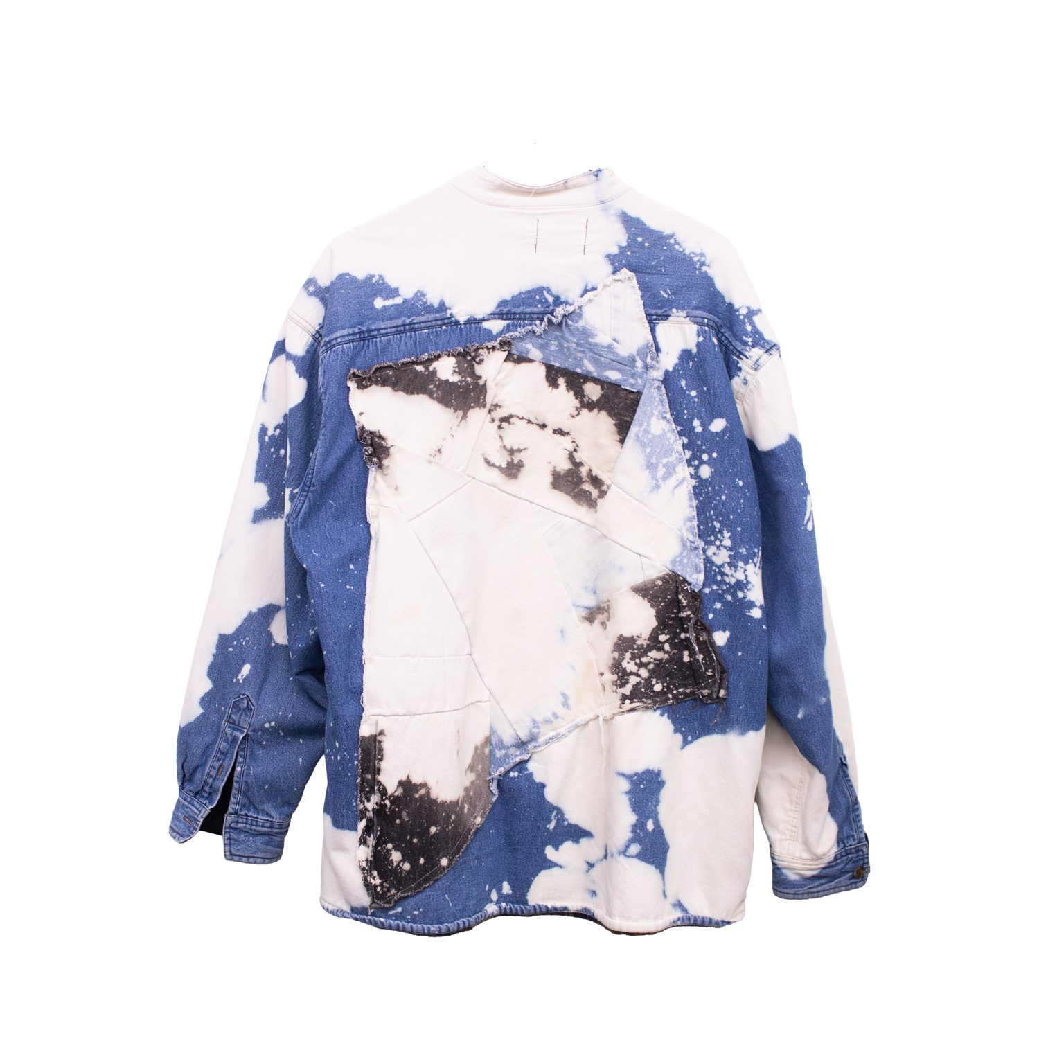 Featuring contrast chest pockets and an oversized raw-edged appliqués paneling across the back